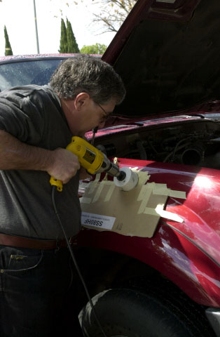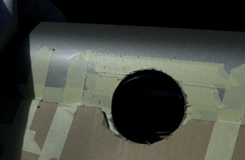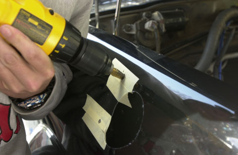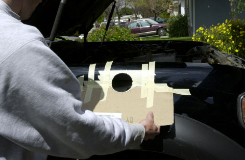 Use a good quality hole saw and a reasonably powerful 1/2" electric drill. Remove the airfilter assembly completely, three bolts attach it to the fender. Remove the lid, undo the hose clamp that connects the mass air flow sensor to the air inlet manifold hose. Remove the airbox 'stuff' from inside the fender, three nuts on the inside of the fender hold it all together - it comes out as two pieces (place in rubbish/trash bin). Using the template, drill a pilot hole for the hole saw. Then use masking tape & cardboard to protect the body. Engage the hole saw on the top & bottom of the fender if possible - grip the drill SECURELY - keep the speed up (1/2 to 2/3 speed on my DeWalt 1/2" drill) and try to not stall the drill, if it slows down apply 'more power' - if it stalls it WILL try and kick back - pull the hole saw back away from the body, get it back up to speed and then re-engage the metal.