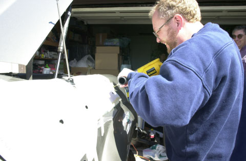 Left picture shows me heating the area that requires to be pressed in to fit the USPS antenna. The right picture shows the wrong way - the last snorkel and Phil manages to melt a small hole into it - epoxy resin to the rescue... Manuel looks on with relief knowing that his is already installed ;-) This step is not required for the new style snorkel since Safari has changed the design to totally clear the US antenna.