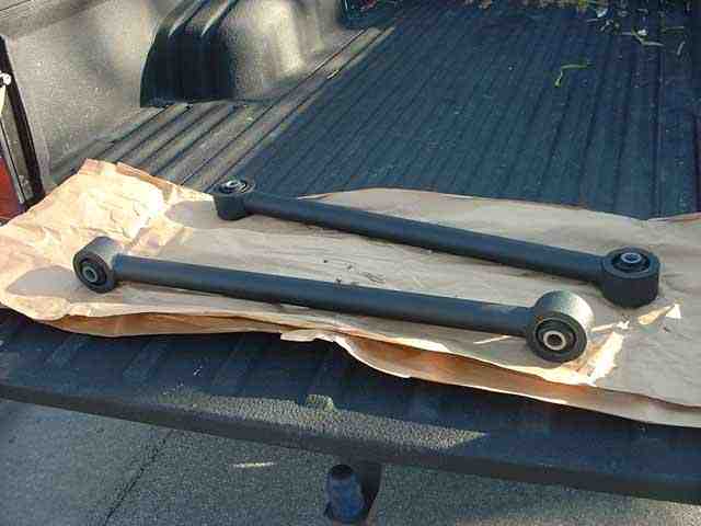 Next in the suspension modification project was new rear lower control arms. Fabricated from 1/4" wall DOM tubing these arms are TOUGH. The ends are machined to take stock OEM bushings. Here's a picture of the prototype set - painted over a plated finish. The arms were made a little longer to compensate for a nominal 4" lift - to rotate the axle back to stock. This means we didn't have to make an adjustable upper control arm.