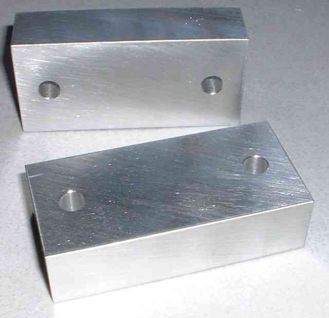 To utilize the OME longer shocks it is necessary to lower the front antisway bar a little so it doesn't hit the prop shaft on full droop. This is easily handled with some spacer blocks. The following picture shows two of the prototype blocks. My thanks go out to David for providing his mechanical design expertise and for getting the blocks & spacers fabricated.