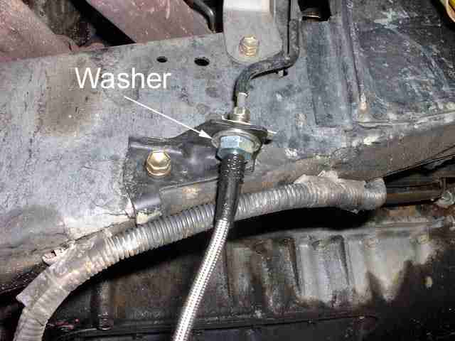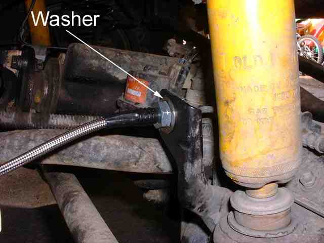 In this picture you can see the washer that was mentioned above. The hole in the OEM bracket is just a little big for the SS line and to make it a nicer install you need the washer. You need a total of 4 washers, one for the rear, once for the USDS front and two on the USPS front. The washer ID is 5/8" and the OD is 7/8". Make sure you get 'thin' washers.