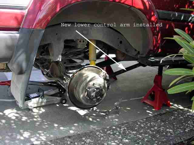 Installing the arms on David's 80. The entire rear end of the 80 is sitting on the jack stands. The two floor jacks are just to adjust the axle to allow the stock arm to be easily removed and the new arm to be installed.
