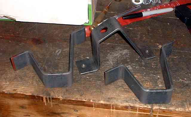 The following picture shows the prototype bracket in the center - with all the holes drilled. Beside it are more brackets that haven't yet been drilled. Since a group of us all wanted to make the same suspension modifications it was time to start a limited production run. After making the prototype bracket it now takes me about 10 minutes to bend up a bracket. The brackets are made from 3/16" x 1 1/2" steel (12" length).