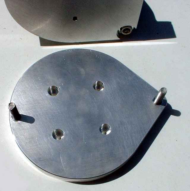 The next step to utilizing the longer OME shocks and to achieve a little more lift required spacers for the front coils. The following picture shows the two piece spacers prior to bolting them together. The spacers are machined to the same tear shape of the bump stop. The bump stop has two studs on the top that bolt it to the spring tower. These studs now bolt to the first spacer section. The second spacer section has threaded holes (where you can see some temporary studs in the following picture) that allow bolts to fix it to the coil tower.