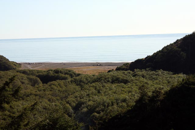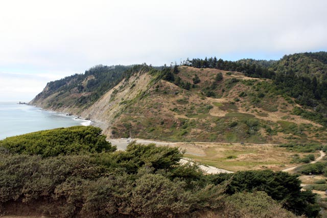 View from the top of Usal road before heading down to Usal beach from the north. There are several camp areas. One is the meadow where the honesty pay box is before the bridge over the creek. The next spot is in the grove near the beach. Another spot is right on the beach front and the last is in the redwood grove just to the lower right.
