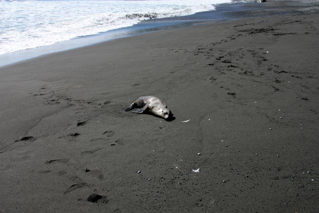 A seal sunning on the beach. It would spend a lot of the day on the beach and then head into the water around dusk. Seemed a little weak, hopefully it was ok.