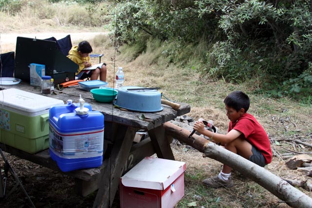 Older one reading, younger one hard at work cutting wood for the fire.