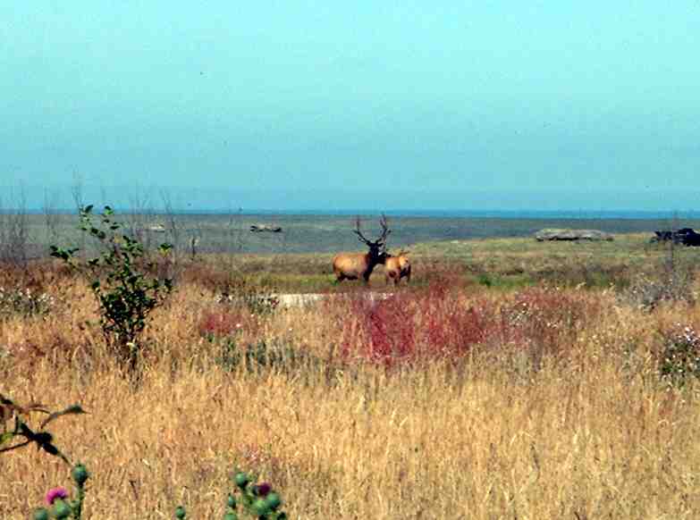 Early morning, elk in the area between the campsites and the beach area. The beach is in the background.
