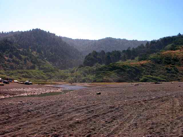 Usal beach - a view of Usal creek - tidal. You can see some of the folks camped on the beach - there are a lot of camp sites in the tree covered area in the far left - much nicer on sunny days.