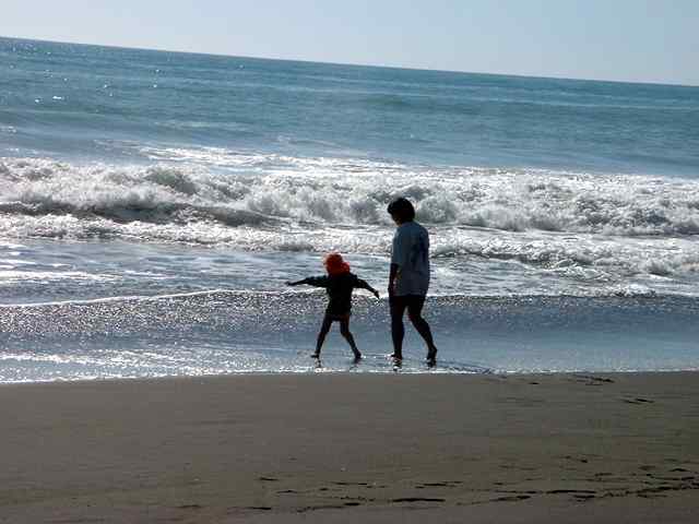 Happy little man with his big brother's sand toys (better than his own set of course...). Mum & big brother are playing chicken with the waves.