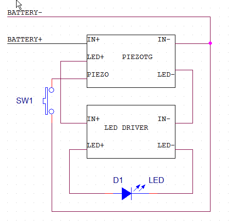 The following shows how the Piezotg board is connected to a simple load like a direct driven LED.