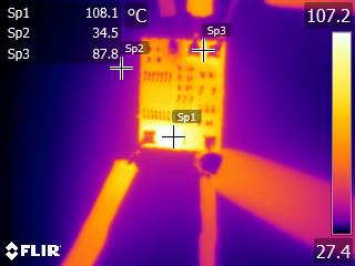 The following thermal picture shows the piezotg board running in air and 10A. Sp1 is indicating the FET temperature (108.1C), Sp2 is essentially ambient temperature (34.5C). Sp3 is the copper trace running between IN+ and LED+. This is after 10 minutes and the board has reached steady state.