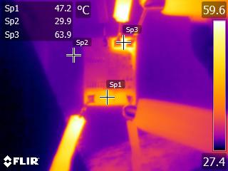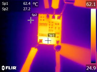 The following thermal picture shows the piezotg board running in air and 7A. Sp1 is indicating the FET temperature (62.4C), Sp2 is essentially ambient temperature (27.2C). This is after 10 minutes and the board has reached steady state.